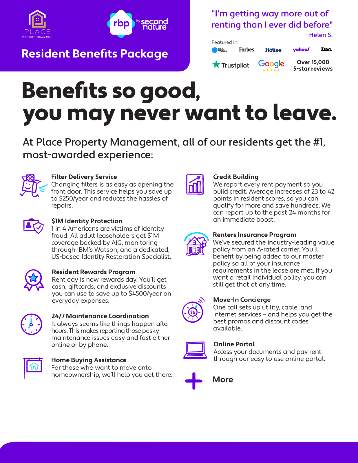 All Place Property Management residents are enrolled in the Resident Benefits Package (RBP) for $39.75/month which includes liability insurance, credit building to help boost the resident’s credit score with timely rent payments, up to $1M Identity Theft Protection, HVAC air filter delivery (for applicable properties), move-in concierge service making utility connection and home service setup a breeze during your move-in, our best-in-class resident rewards program, and much more! More details upon application.